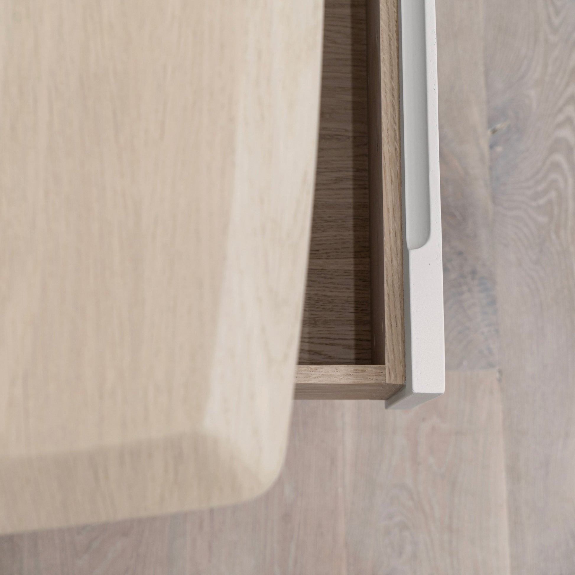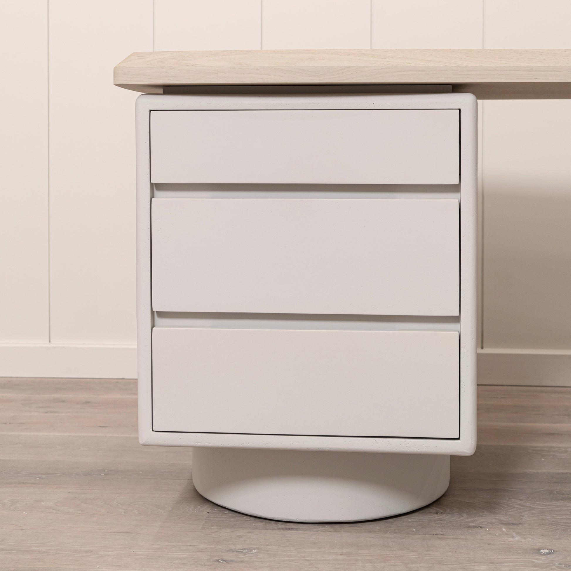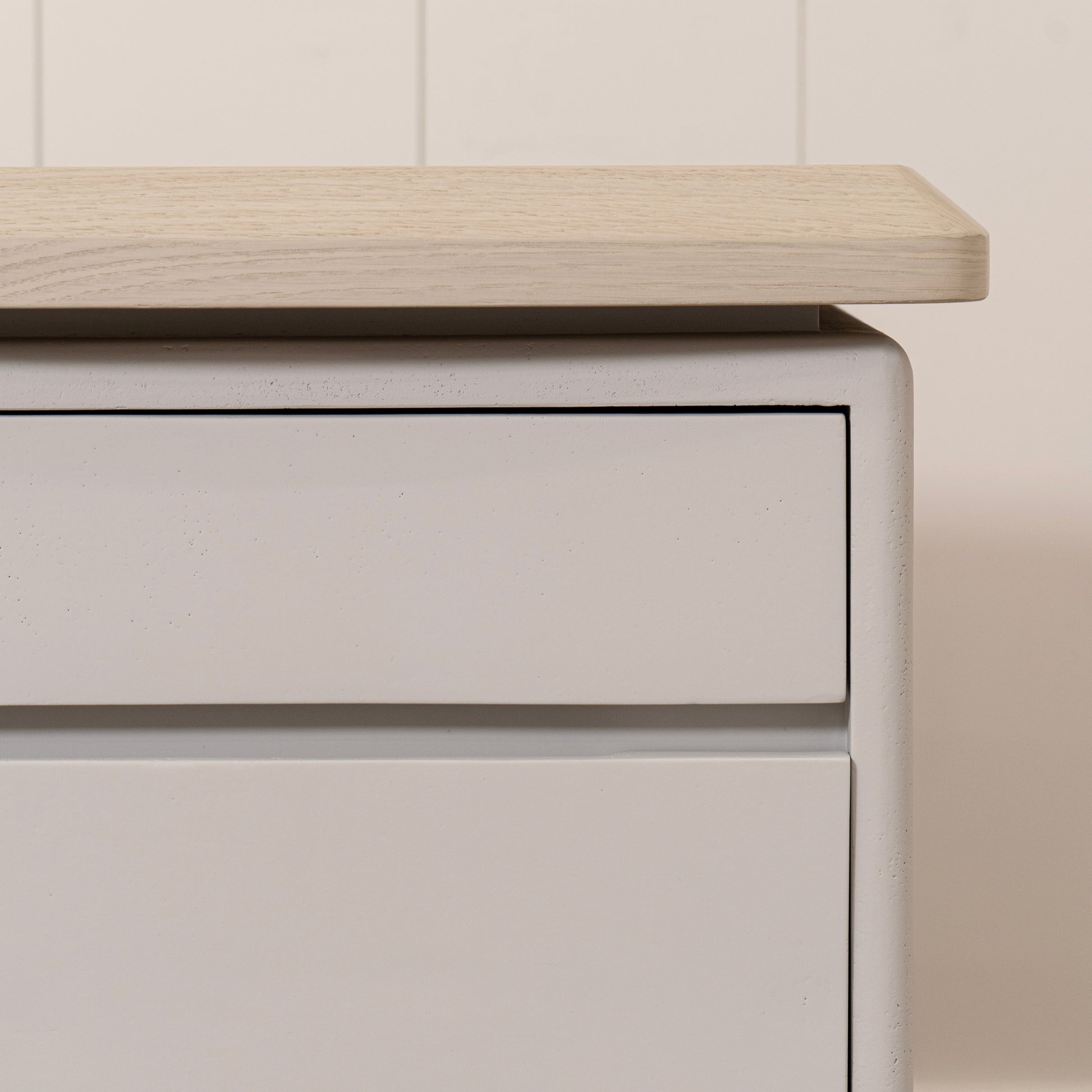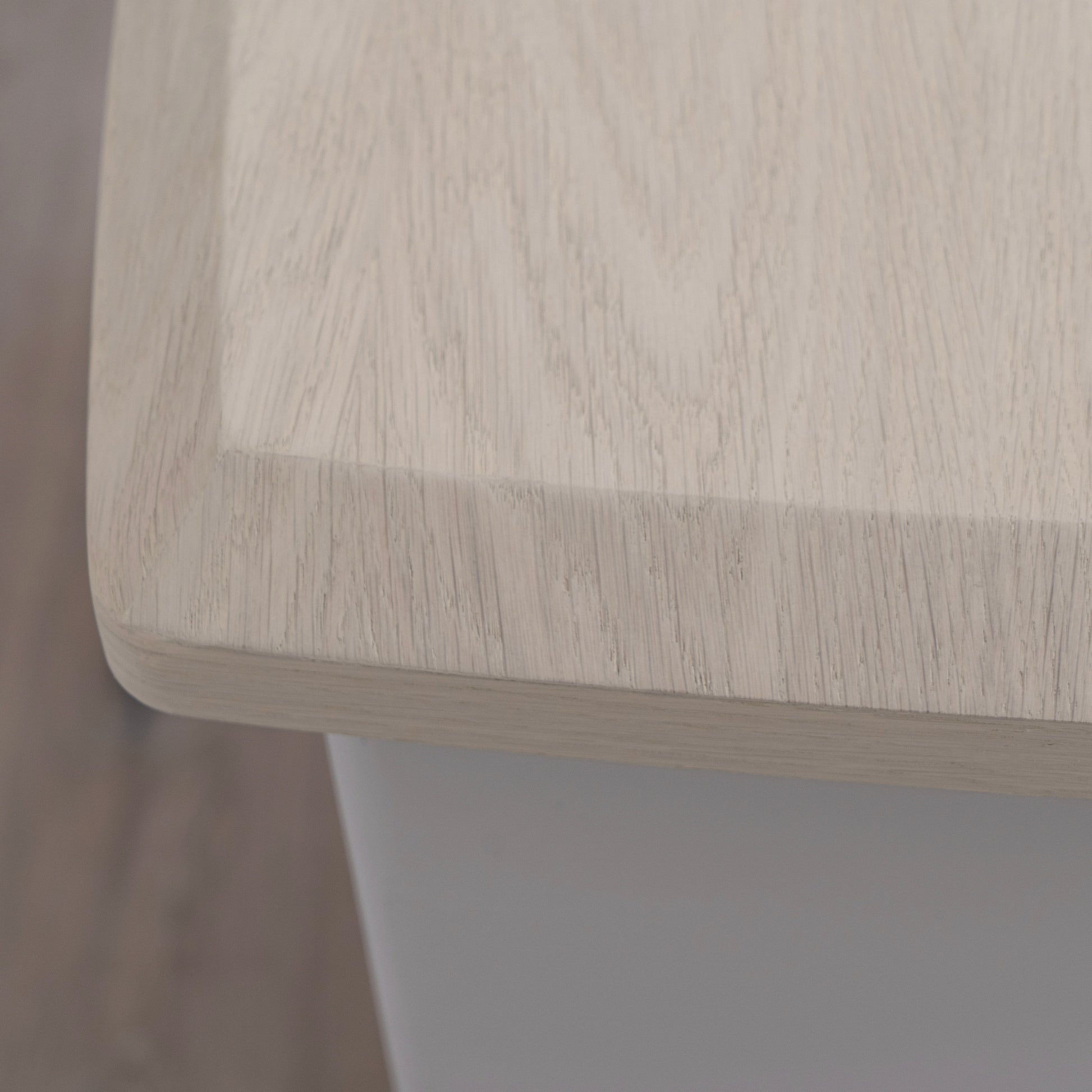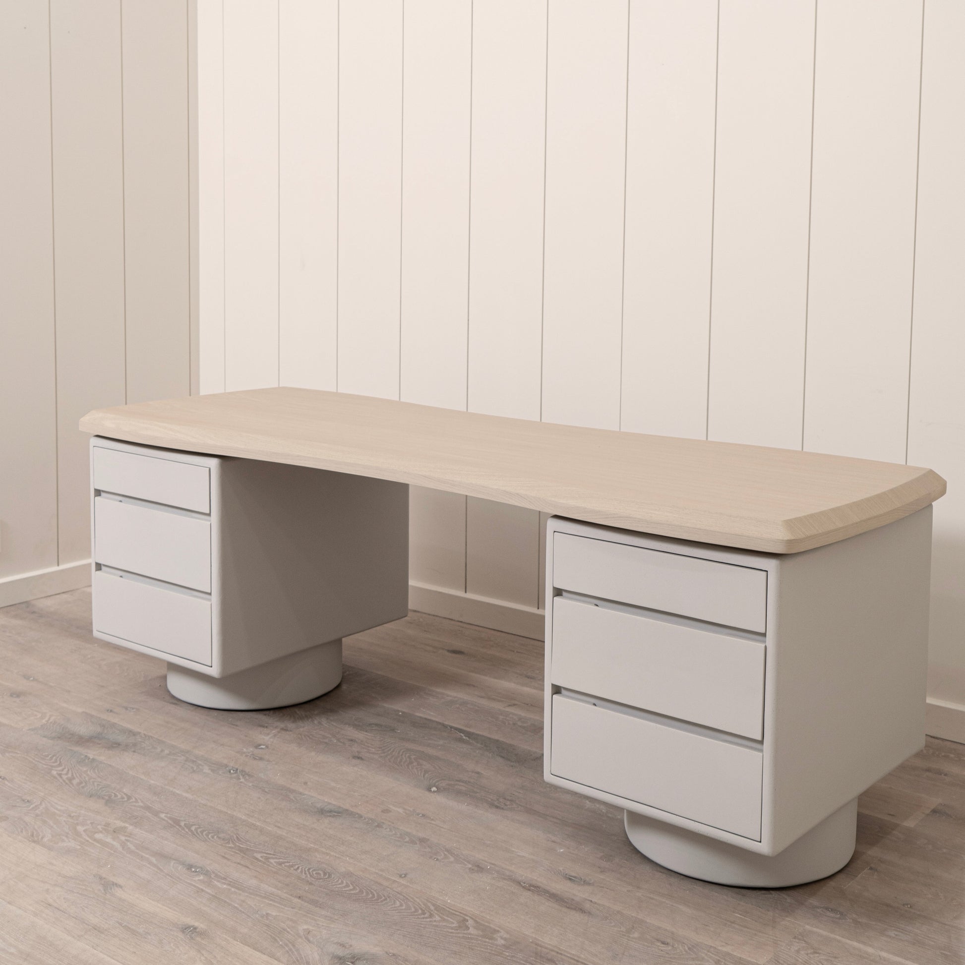 Variante 1 - Beach White (dessus) en chêne reconstitué avec un détail biseauté, plâtre calcaire (base) en étain Revere